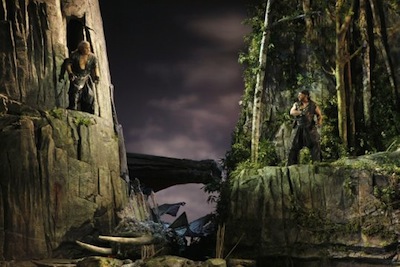 A new day dawns around the Valkyrie Rock where Siegfried and Bruennhilde are. Siegfried can be seen in full armour in the sunlight. He wants to go wandering in search of new heroic deeds. Bruennhilde lets him ride her horse, Grane, and Siegfried gives the Ring to Bruennhilde, as a token of his faith. After a passionate farewell, Siegfried rides down the mountainside toward the River Rhine. Bruennhilde can hear the sound of his hunting-horn from the distance.