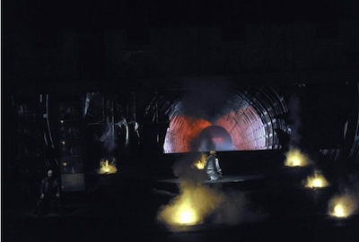 Wotan gazes thoughtfully Siegmund's corpse and then turns to Hunding who is gloating over his victory. He gives Hunding one contemptuous gesture and Hunding falls down dead. Then he turns to chase Bruennhilde, the rebel, who dared disobey his order and leaves with thunder and lightning.