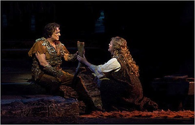 Siegfried asks the bird if the bird knows where he could find a suitable companion. The bird tells him about Bruennhilde, who is lying in deep sleep, surrounded by a magic fire which can be penetrated only by one who knows no fear. Siegfried realizes how stupid he was, trying to learn fear and now follows the woodbird who will lead him to Bruennhilde.